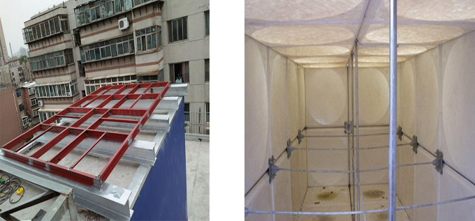 玻璃鋼水箱槽鋼底座                                                  玻璃鋼水箱內部拉筋及支撐